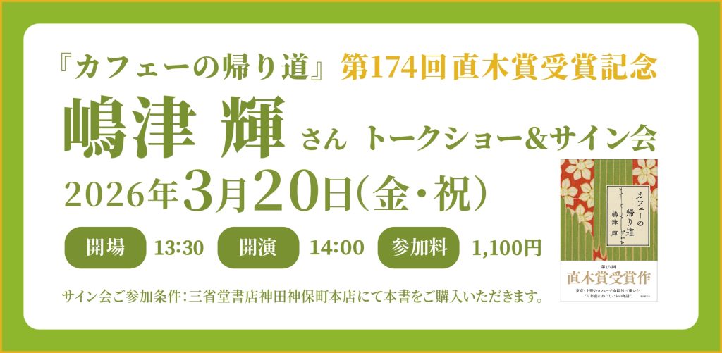 日時:2026年3月20日(金・祝) 13:30開場 14:00開演 15:30閉演 イベント内容:トークショー+サイン会 ・トークショー 14:00-15:00 会場:三省堂書店神田神保町本店 3階 イベントスペース ご参加費用:1,100円(税込) 定員:30名 |
