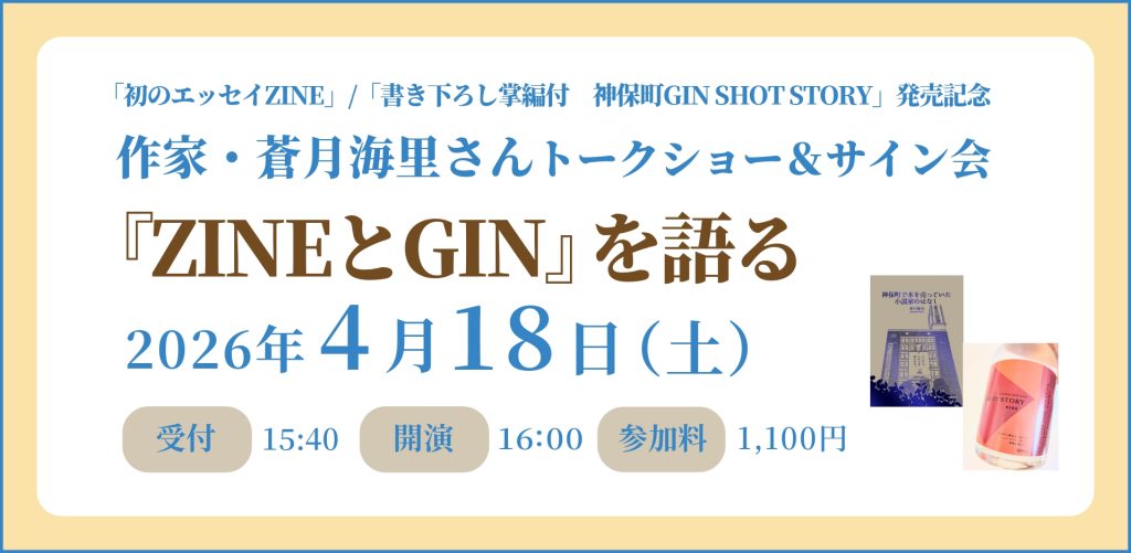 『神保町GIN “SHOT STORY”~2026 Spring Ver.~ 蒼月海里 書き下ろしラベル』と、かつて三省堂書店神田神保町本店に勤務していた時のエッセイZINE『神保町で本を売っていた小説家のはなし』の発売を記念して、作家・蒼月海里さんのトーク&サイン会を開催いたします。